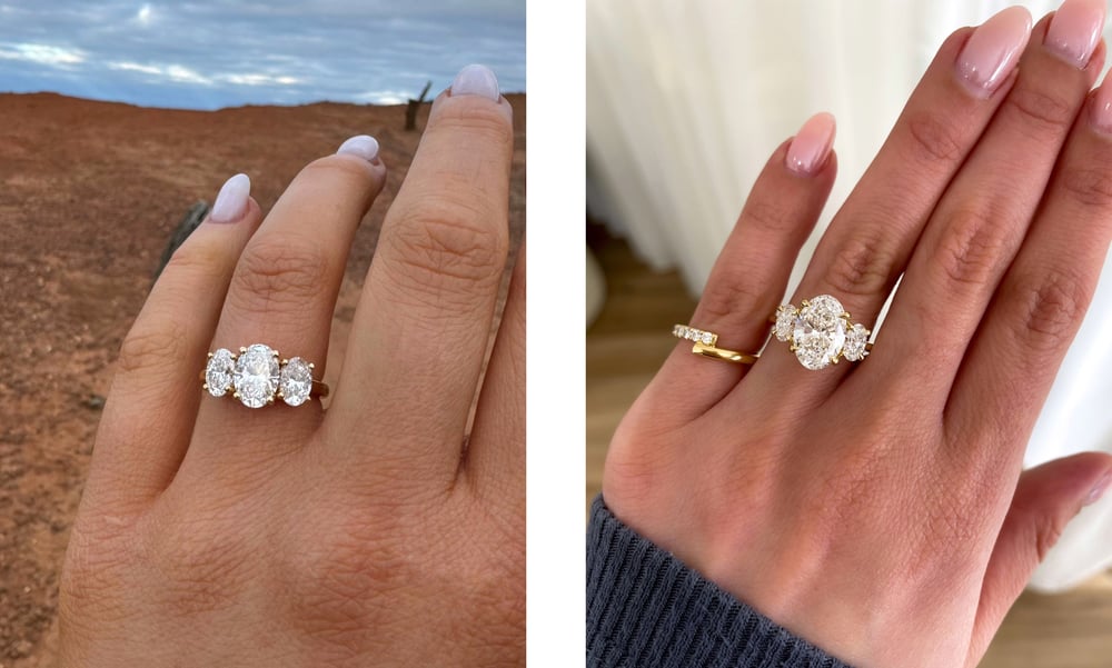Two custom oval trilogies showcasing how a different centre stone ratio can affect its overall look