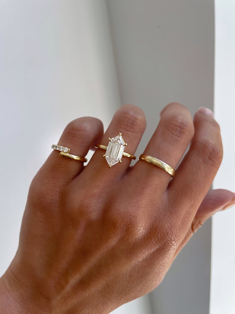 The elongated hexagon diamond shape, recognised for its unique clean lines and unusual appearance, evokes a vintage-inspired look. Its unique look and symbolism make it a popular choice for those seeking distinctive ring settings.