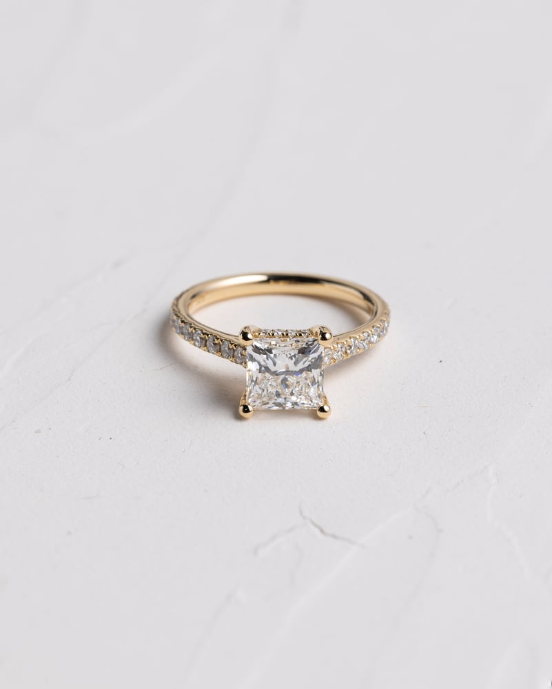 The princess cut diamond is celebrated for its modern look, distinguished by sharp angles and geometric shapes. Its clean lines are indicative of harmony and balance, qualities that are desired in modern romantic relationships. Princess cut diamonds showcase a square shape, maximising the sparkle of the stone. It’s an unusual diamond shape that exudes contemporary sophistication, making it one of the most sought-after diamond shapes. The four sides of the princess cut diamond can represent trust, understanding, honesty, communication. These values are reflected in the structural integrity of the cut.