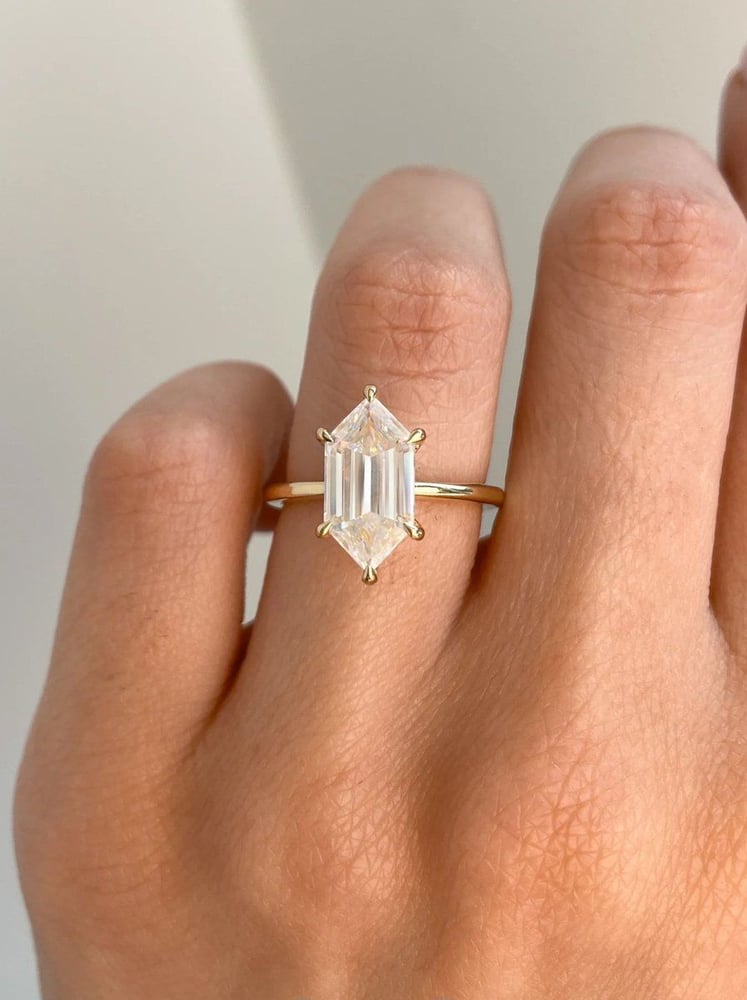 The elongated hexagon diamond shape, recognised for its unique clean lines and unusual appearance, evokes a vintage-inspired look. Its unique look and symbolism make it a popular choice for those seeking distinctive ring settings.