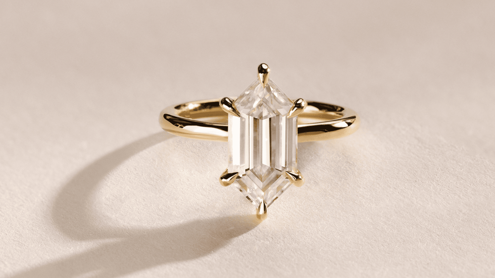 A harmonious blend of geometry and elegance, the Elongated Hexagon cut offers a contemporary spin on traditional diamond shapes. Stretching the classic hexagonal silhouette, this cut introduces a refined elongation that captures light uniquely.