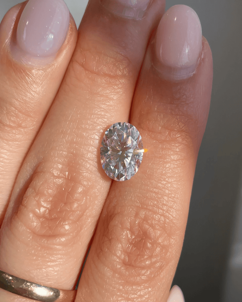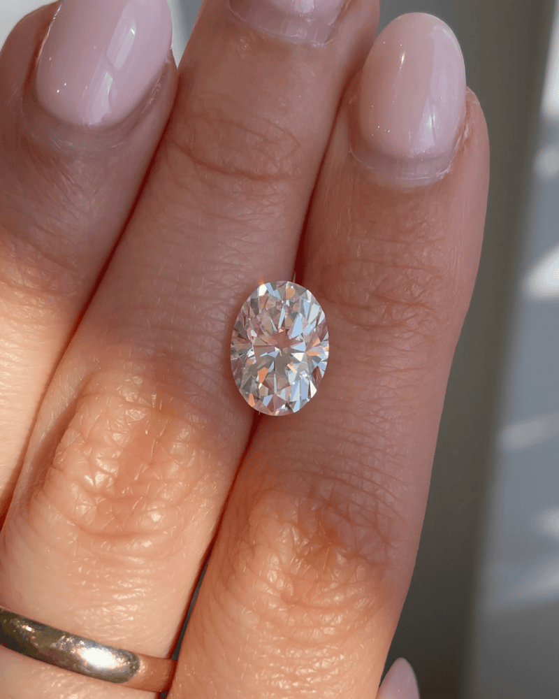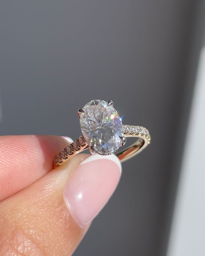 Due to that extra fire and brilliance, most of the time a white moissanite stone will look colourless, but in certain lightings and angles, there may be hints of coloured overtones. On a sunny day, moissanite will sparkle with rainbow tones. This is often very subtle, and only the actual ring wearers may report this effect in hue as they see the ring under different types of light. In the end, this is quite an indistinguishable difference that will most likely all but go unnoticed.