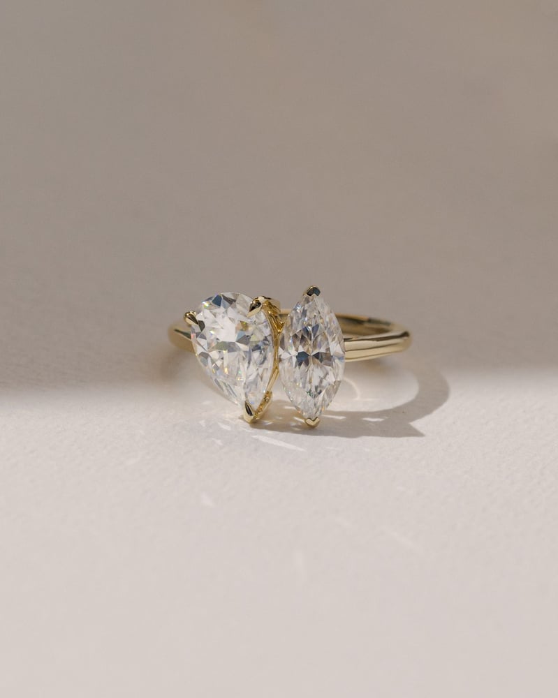 There are no hard rules when it comes to toi et moi setting carat weight. Mixing carat weights, like mixing stone cuts, can be a wonderful way to incorporate smaller stones into a toi et moi engagement ring. Our Amor ring features an emerald cut stone beside a pear, offering a balanced contrast.