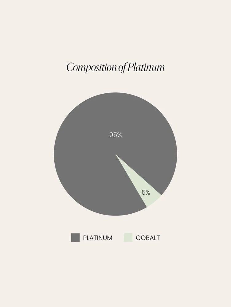 Platinum is a sleek, silvery-white precious metal with an unmistakable shine. Platinum’s natural strength is enhanced by adding a small percentage of another metal before it is crafted into jewellery. Jewellers may choose a range of metals to add to the alloy to strengthen it. At Cullen Jewellery, we use cobalt. Like platinum, cobalt is naturally hypoallergenic, making platinum rings a great option for people with metal allergies. Platinum is extremely durable and will not tarnish or corrode. Platinum jewellery comes at a higher price than gold jewellery due to its relative rarity, density, and strength.