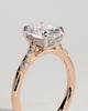 The Jamie engagement ring showcases a stunning 4-claw oval cut centre stone, sparkling hidden halo and an elegant cathedral setting featuring two pairs of opposing marquise cut side stones delicately graduating along the band.