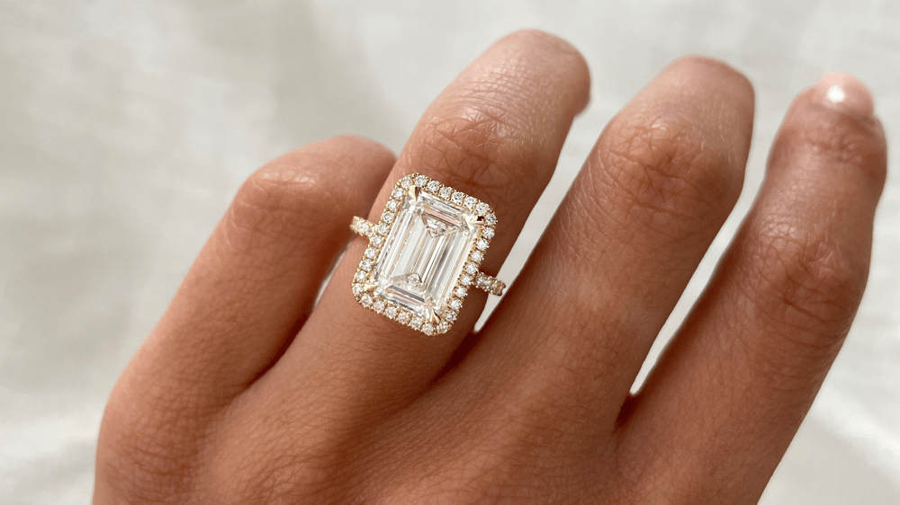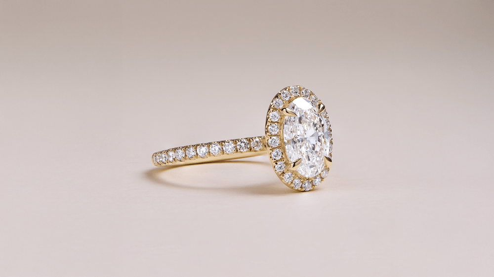 In line with the softer look – an oval cut engagement ring looks beautiful with a halo surrounding it. The longer edges of the oval cut lend itself to having a halo as it accentuates the curves and swoops of the oval shape. The oval cut is a popular celebrity engagement ring choice and plays into the popularised old money trend too. That said, if your budget doesn’t stretch to a high carat weight, adding a halo can get the look you want at a price that suits.