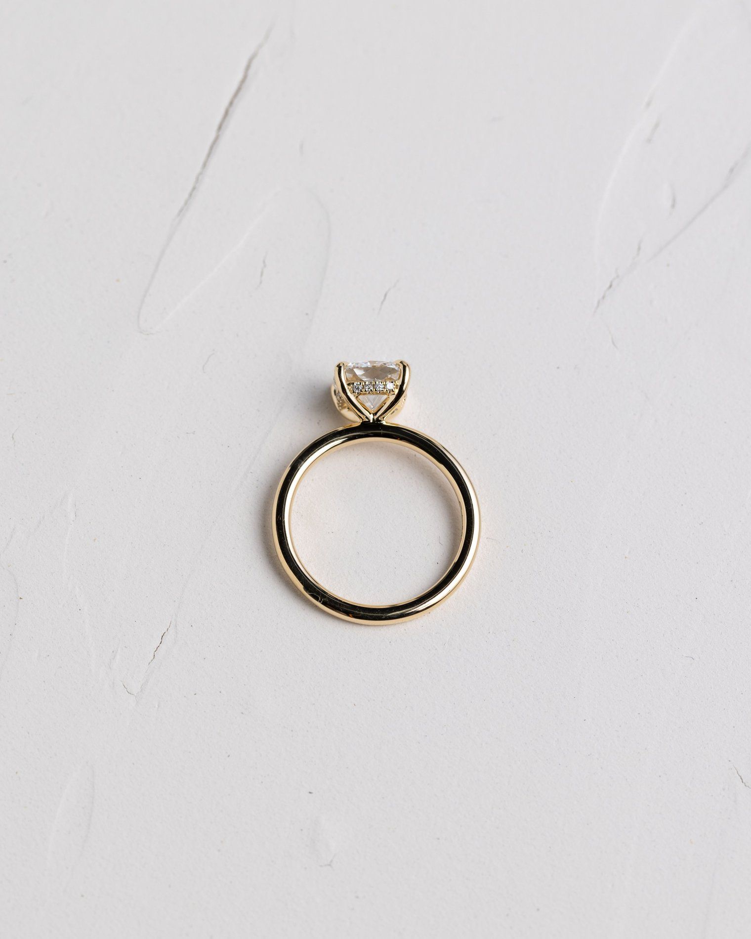 Cleaning your moissanite engagement ring at home is actually very easy! You can clean your engagement ring at home using products that you already own. Simply fill a bowl with warm water and add some liquid dish soap. Let your ring soak for a few minutes before using a soft toothbrush to carefully scrub your ring, focusing on the hard to reach areas within the claws and setting. After your engagement ring is nice and clean, rinse it well under running water and either let it air dry or use a lint-free cloth to dry it off.