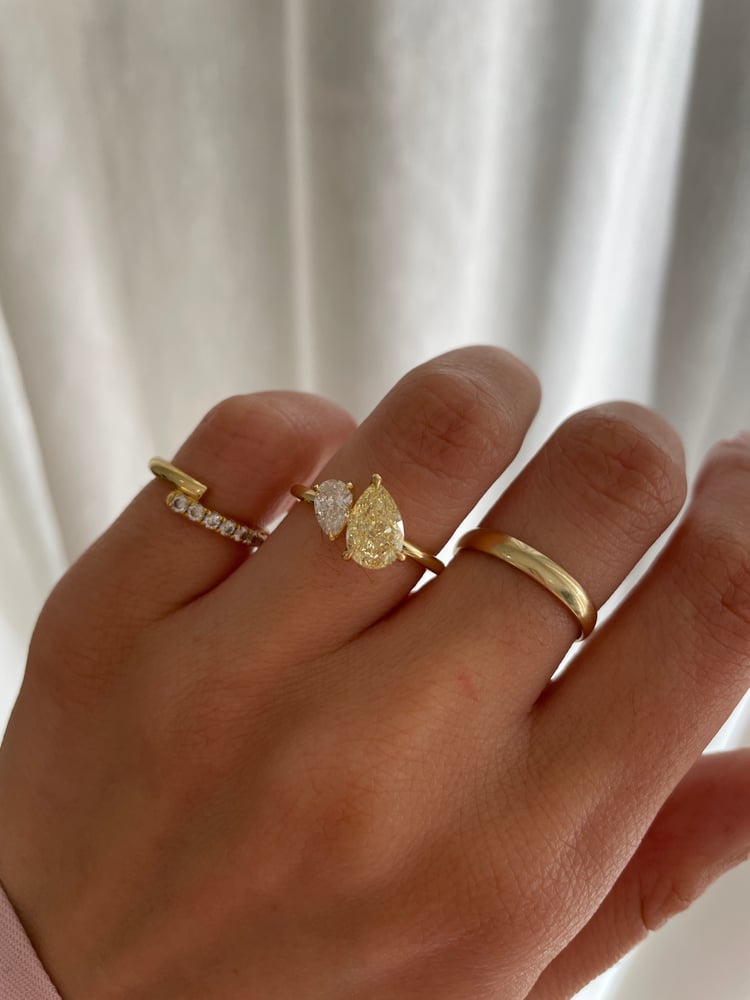 The bezel set of this ring highlights another trend we’ve seen rising in the last year, which started with specialist jewellers and is now a commonly found, enchanting setting. A bezel set can be found in a full bezel or half bezel setting, whereby the metals of the ring surround the edges of the centre stones. It’s a beautifully bold and special look, which compliments the other popular engagement ring trends from this year. This style appeals to those seeking a contemporary twist on the classic engagement ring, while also catering to active lifestyles thanks to its secure design. So if you know you’re be rough on your engagement ring, a bezel setting could be ideal for you.