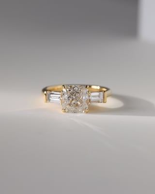 Baguette Cut: Often used as side stones, baguette diamonds are small and rectangular with step-cut facets. These striking stones are used to add sharp, geometric accents.