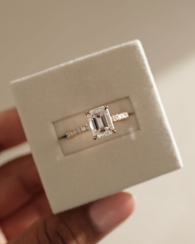 The emerald cut is synonymous with the 1920s. Its long, step-cut facets highlight the centre of the stone, creating a captivating depth and sparkle that’s unmistakably Art Deco. Pair an emerald cut diamond solitaire with a pavé band for the ultimate Art Deco look.