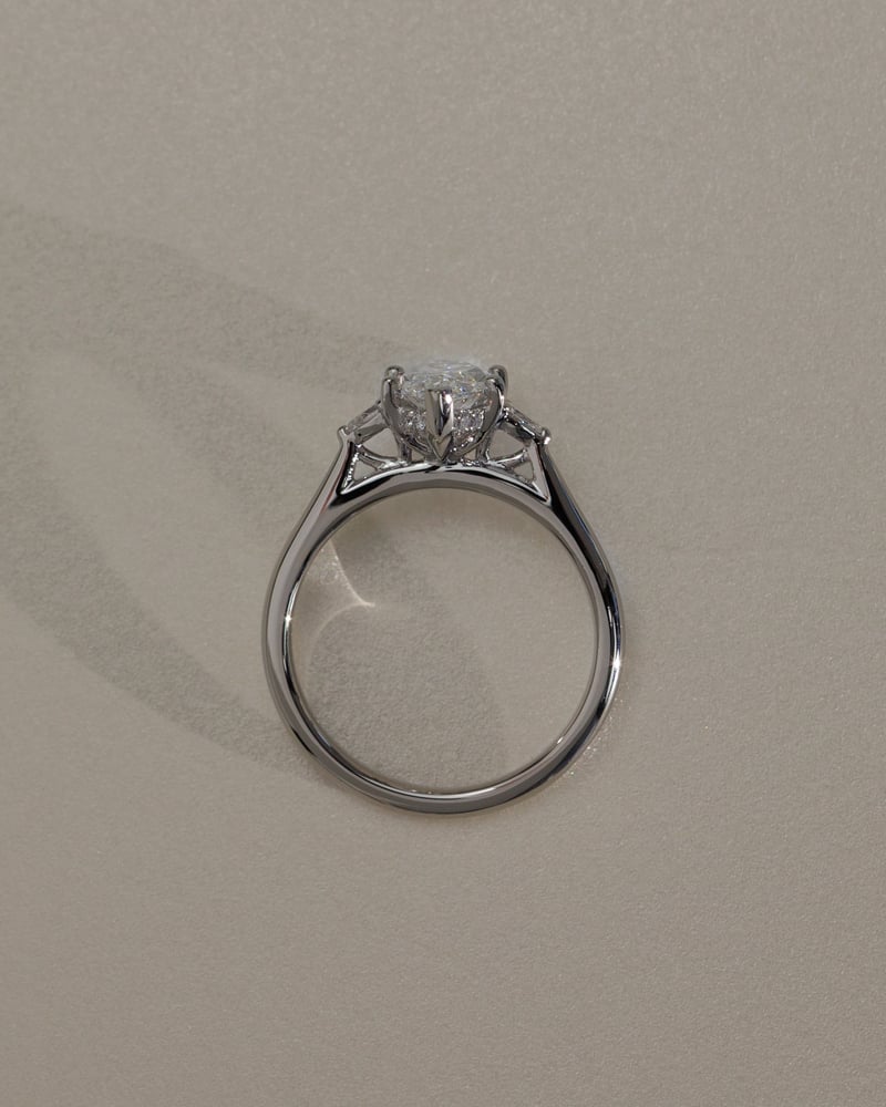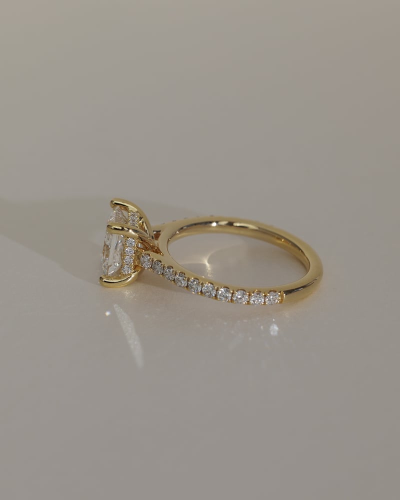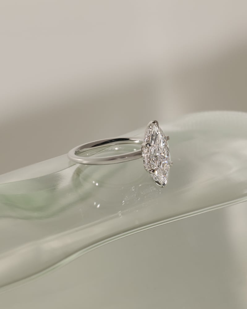 Oval cuts are among the most popular choices for hidden halo settings. The elongated silhouette of oval diamonds creates finger-flattering elegance, while the hidden halo emphasises the stone's graceful proportions from side angles. The combination of an oval's brilliant sparkle with the secret shimmer of a hidden halo creates dimensional beauty that shifts as the ring moves. Our Emma Classic Oval Solitaire is a great example of this classic elegant ring that is a treat to see from all angles. Hidden halos adapt seamlessly to virtually any diamond shape. Cushion cuts gain romantic softness, pear shapes achieve elegant distinction, and emerald cuts showcase Art Deco sophistication – all enhanced by the secret sparkle of hidden halos. Even a stone as striking as a marquise can be complemented with a hidden halo. Our Hannah Marquise Trilogy with Pear Side Stones and a Hidden Halo has the sweeping lines of the cathedral setting, sharp corners of the stones and is really married together with the uniformed halo.
