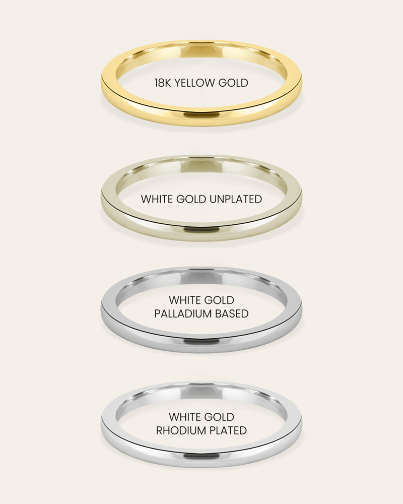 The karat weight of white gold significantly affects its natural colour and how it looks with or without rhodium plating.