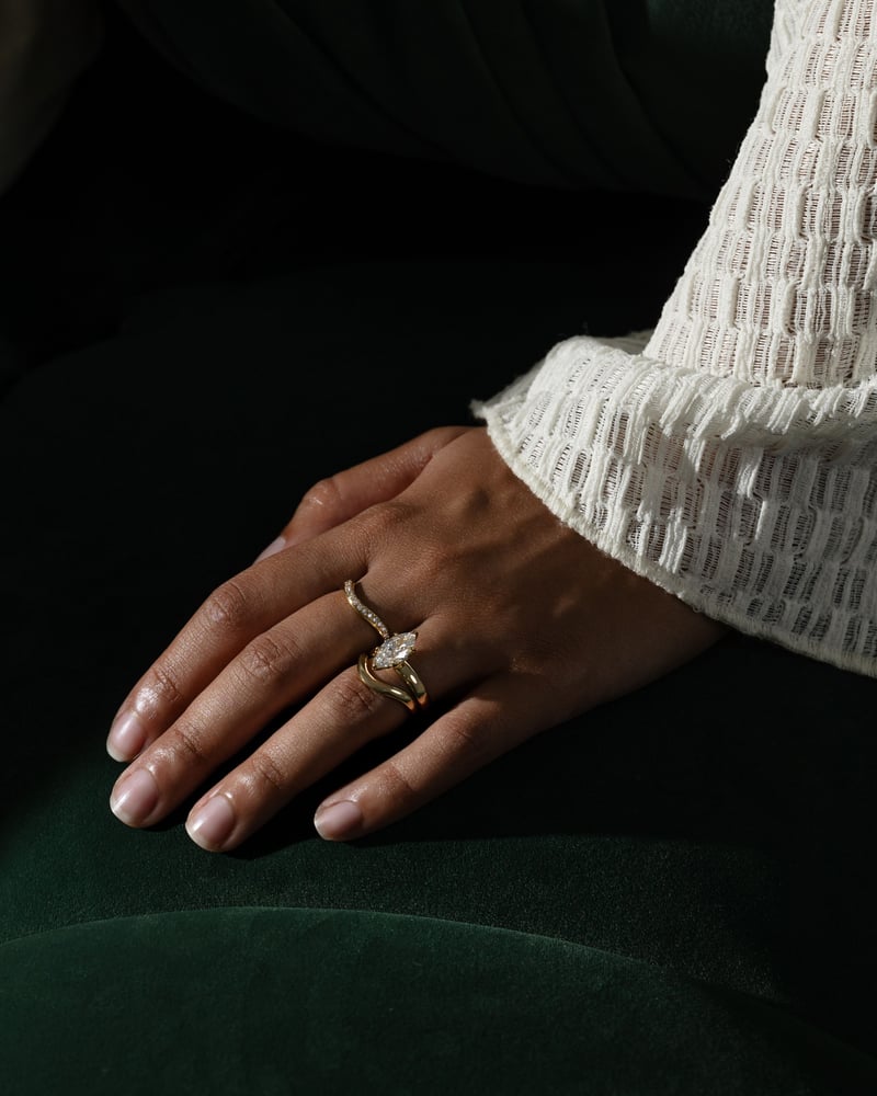 Thicker bands have the added benefit of being flexible in the sense that they can have flat or a more curved profile, or even the band can be entirely curved such as our Hayley Oval Solitaire . This gives a more cohesive, stacked look that is intentional.