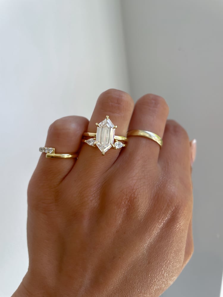 Most cuts like a cushion cut engagement ring or a princess cut engagement ring can be paired with a classic eternity band like our Kaitlyn Half Pavé Wedding Ring, which is smartly designed with diamonds round the front, for an overall classic look that doesn’t break the bank. If you’re looking for a wedding band to pair with a centre stone and a sharp contour, (like a marquise or pear cut ), opt for a curved wedding band with a centre “dip” to seamlessly accommodate your engagement ring. For a glamorous art-deco-inspired look, our Harper Curved Wedding Ring is a great way to dress up your engagement ring look. Another great option for any less traditional centre stone cuts is an open wedding band, which has a gap in the front for the centre stone to slip into - with accent stones on each side. Our Pearl Open Wedding Ring has pear-cut stones on either side, which can dress up the look of a traditional engagement ring, and overall, help you achieve an bigger look for dressier occasions.