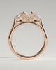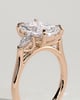 Jasmine is a radiant-cut centre stone set in a trilogy arrangement with pear-shaped side stones. The centre is elevated within a cathedral-style structure with refined claws, paired with a plain band for a clean, balanced design.