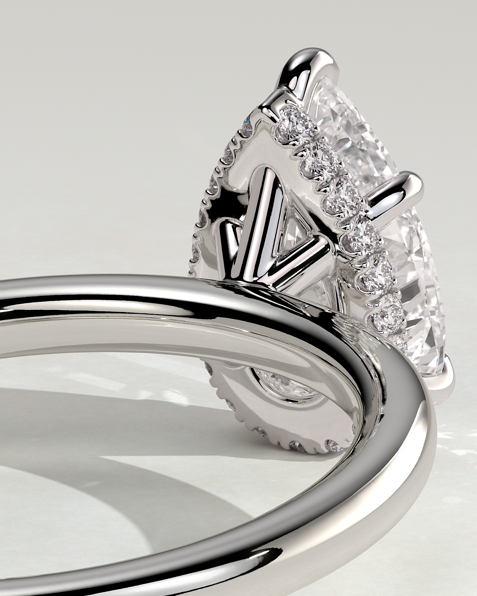 The Ainsley engagement ring is a high-set pear solitaire design with five eagle-tipped claws and a wrap-around hidden halo.