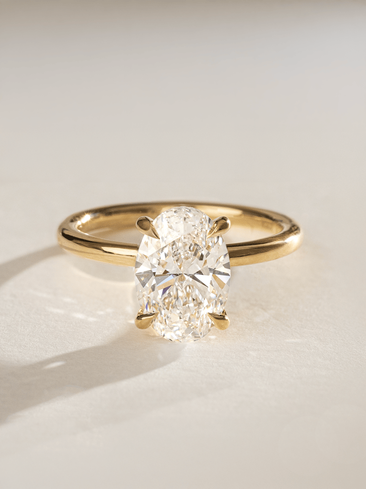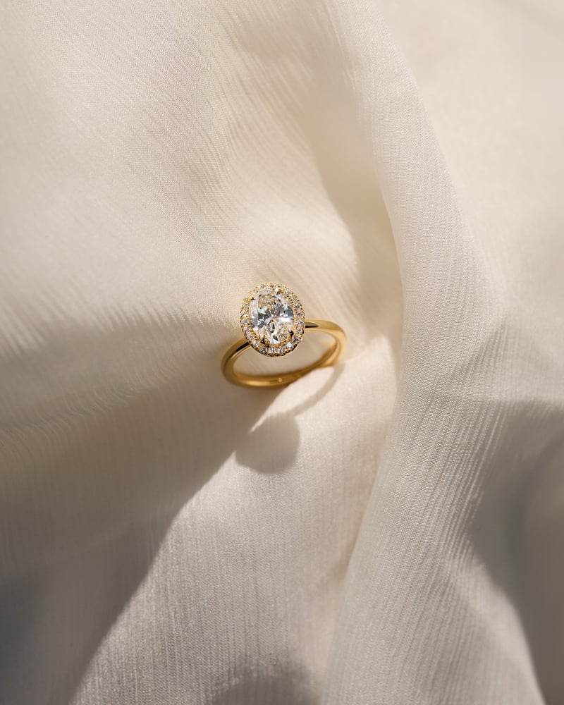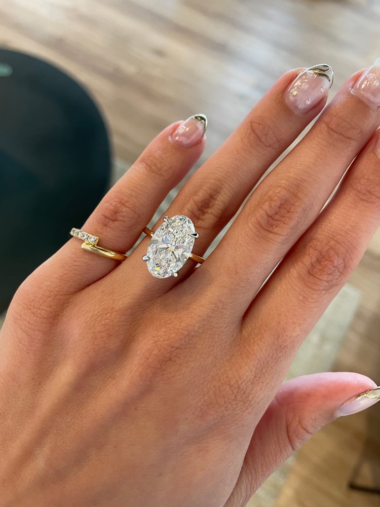 Custom-designed by Jack Solow of Solow & Co. Inc Diamond Jewelers, Hailey's engagement ring features a classic 18K yellow gold solitaire band with a hidden diamond halo basket that elevates the oval centre stone. The solitaire setting exudes traditional elegance, and the choice of yellow gold adds a vintage charm that's both malleable and easier to maintain than white gold.