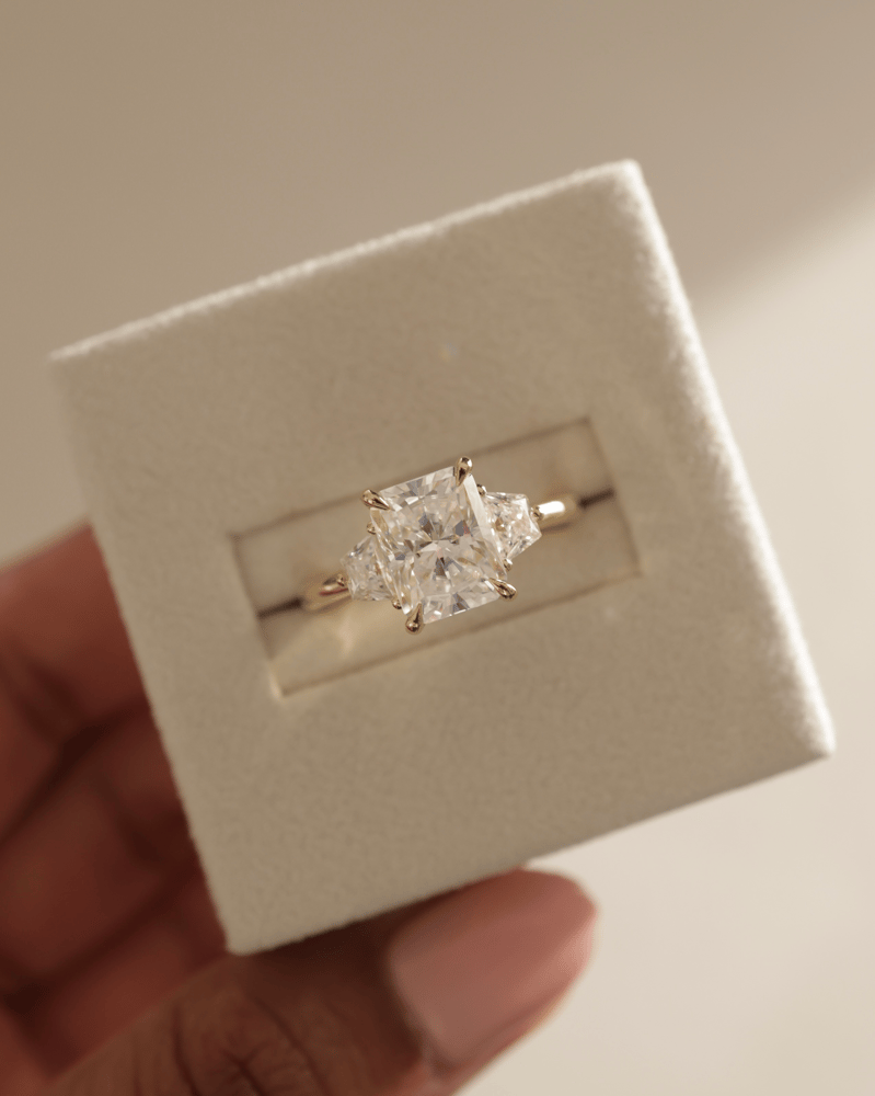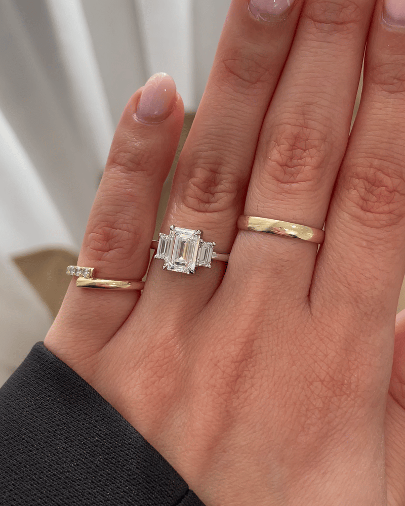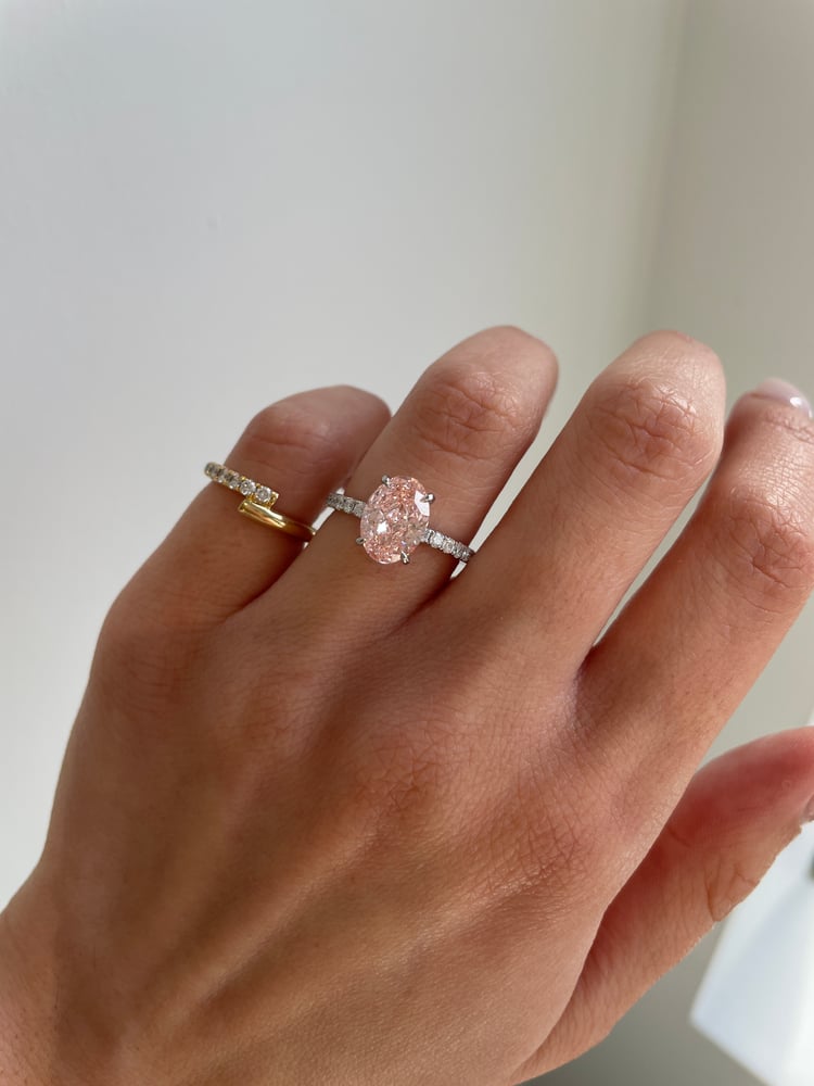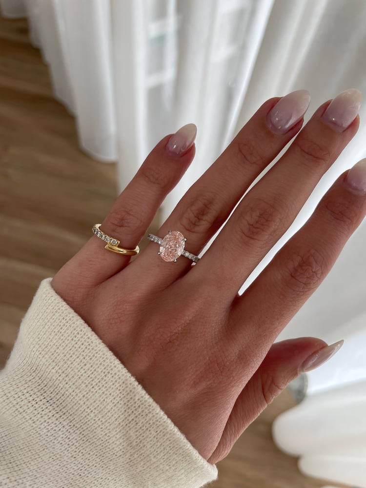 Gracing Hailey's ring is a mesmerising oval-cut diamond. With a history dating back to the 1300s, this fancy-shaped diamond cut has an elongated design that creates the illusion of a larger size and slenderises the wearer's fingers. A versatile choice, oval-shaped diamonds pair beautifully with various settings, from vintage styles to three-stone designs.